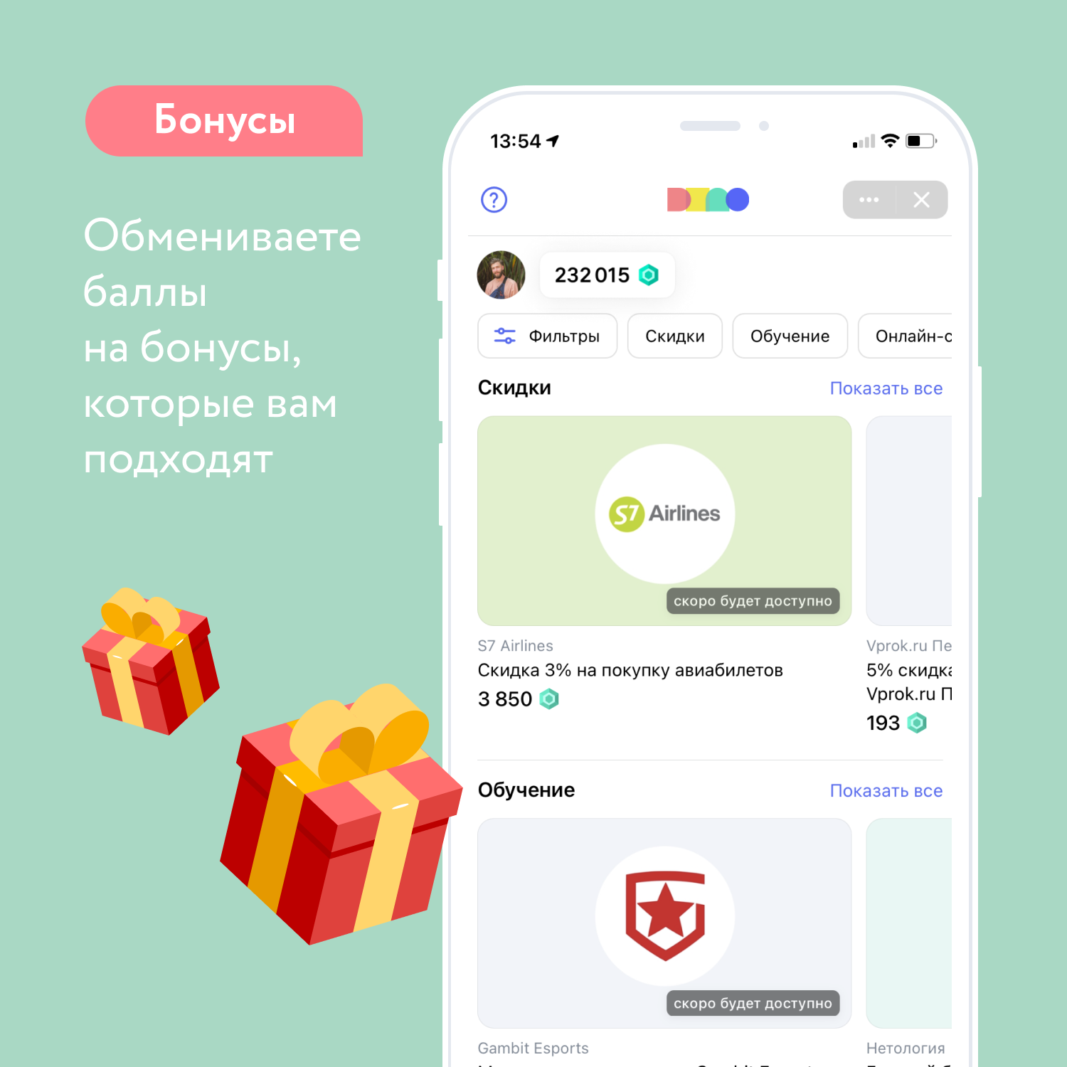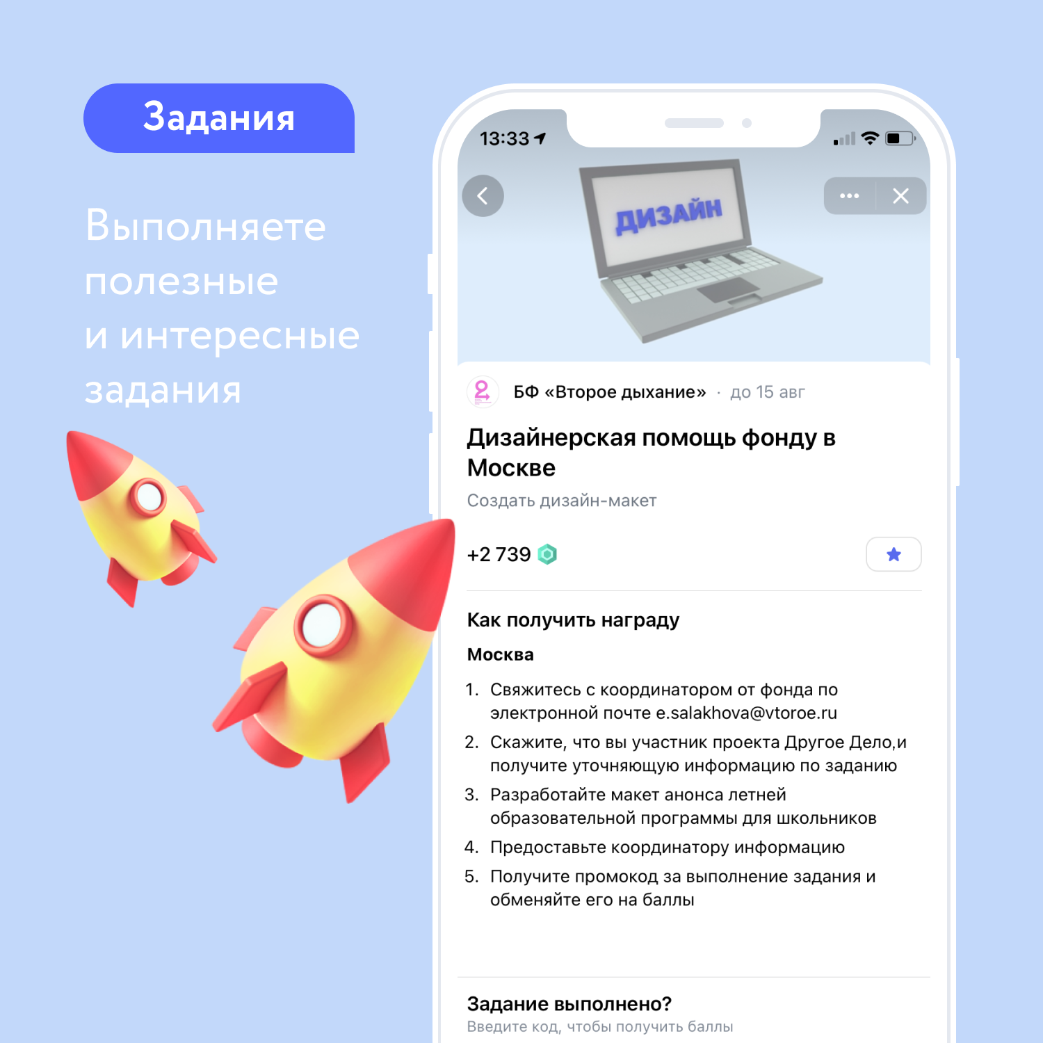 Задания направлены на всестороннее развитие, социальную активность и здоровые привычки: баллы можно заработать на занятиях спортом, чтении книг, посещении выставок, прогулках с собаками и многих других видах активностей. Есть задания и для детей, поэтому можете смело привлекать их к полезным задачам, мотивируя бонусами!