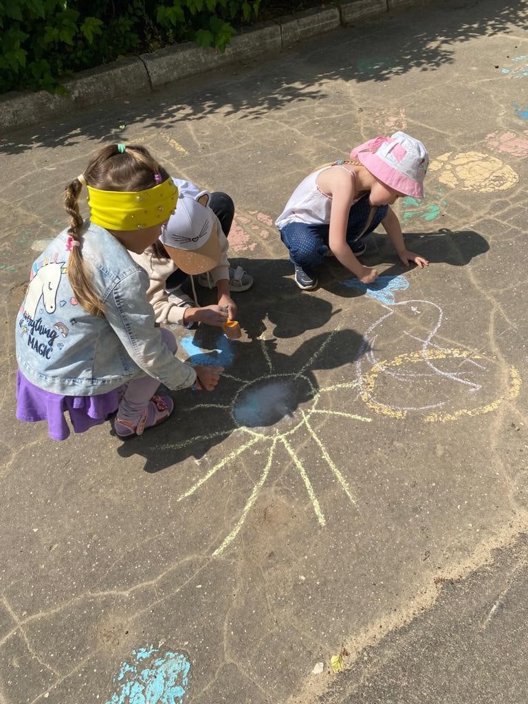 На прогулке дети раскрасили площадку солнцем и мирным небом.