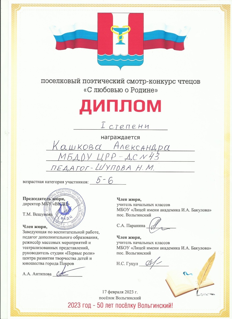 17 февраля, наши воспитанники приняли активное участие в поселковом смотре - конкурсе чтецов "С любовью о Родине..." От нашего сада в конкурсе приняли участие семь воспитанников. Это дети старшей и подготовительной групп. Выступление участников отслеживало жюри, и каждого участника провожали одобрительными аплодисментами. Наша участница Кашкова Александра заняла 1 место в своей возрастной категории. А остальные участники были награждены дипломами за участие и подарками. Для каждого ребенка конкурс чтецов является ответственным моментом в жизни,обогащающим его впечатления, развивает творческую активность, способствует всестороннему развитию ребенка. Выражаем огромную благодарность родителям и воспитателям групп, участвующих в подготовке чтецов к конкурсу.