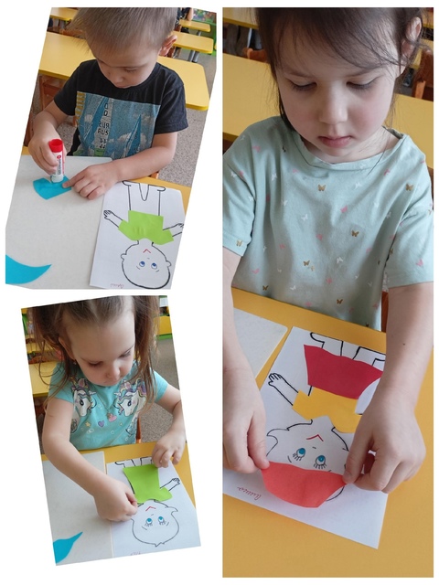 Ребята с интересом играли в дидактические и речевые игры и упражнения: «Какая бывает одежда?», «Чудесный мешочек», «Из каких частей состоит одежда?» и др. С удовольствием занимались продуктивной деятельностью: сделали аппликацию "Наряди Мишу и Машу".