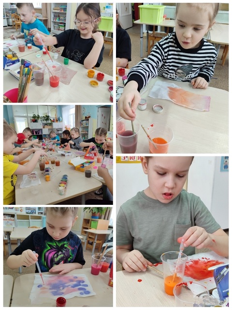 В подготовительных группах ребята с увлечением превращали простые краски в целую палитру новых оттенков. Жёлтый с синим рождал зелень, красный с жёлтым – оранжевый, а капля синего в красном дарила неповторимый фиолетовый. Маленькие художники экспериментировали с пропорциями, добиваясь всё более интересных и необычных сочетаний.